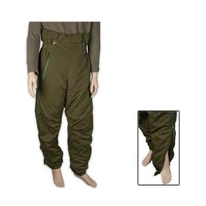 These authentic military surplus Swedish OD M90 Thermal pants are used but in good condition. These quilted pants are very warm and feature two full length zippers, one on each side. The quilted nylon lining and elastic waist adjusters make these thermal pants comfortable and warm, at the same time. The leg cuffs are elasticated. Available in sizes Small and Medium.
